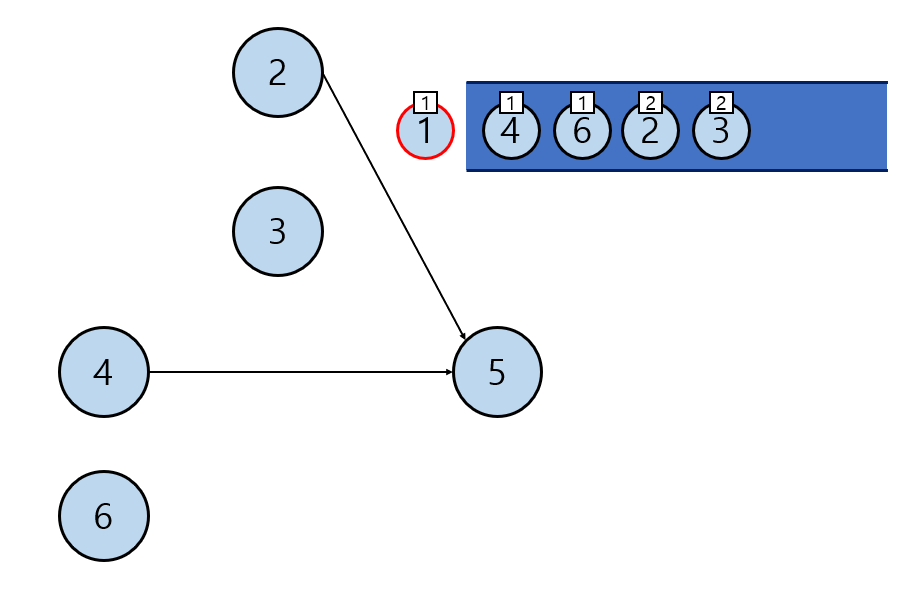 - 진입차수가 0이 된 5번 노드를 큐에 넣어준다.