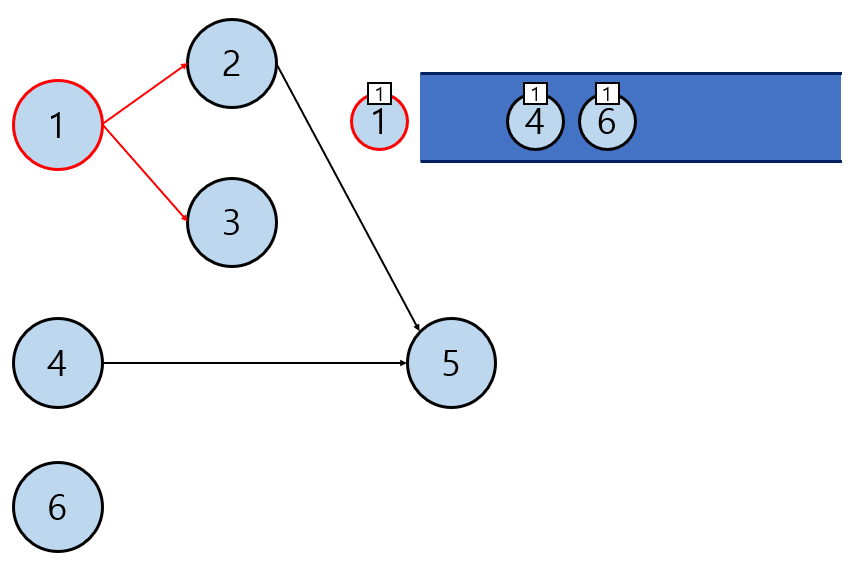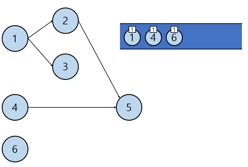 - 여기서 1번 과목, 4번 과목, 6번 과목의 경우 들어오는 간선이 없으므로 진입차수가 0이다.
