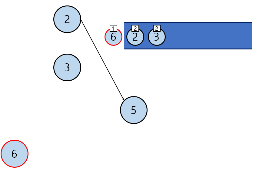 - 여기서 2번 노드와 3번 노드의 경우, 각각 진입차수가 1이었지만, 이 과정을 통해 진입차수가 0이 된다.